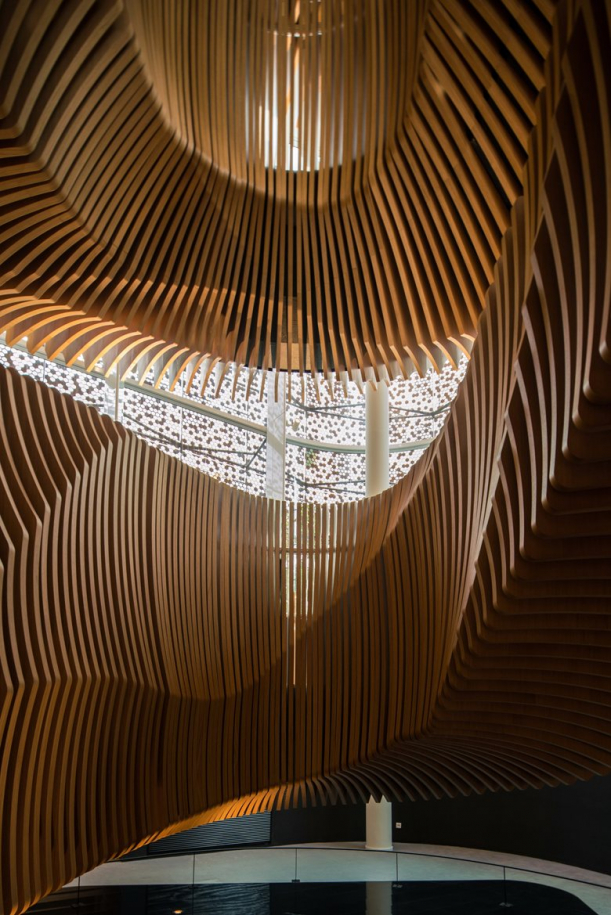 Schodiště vyniká biomorfní strukturou, která vypadá jako tornádo v klidném kancelářském prostředí. „Překonává samu architekturu. Kanceláře jsou záměrně minimalistické, aby navodily pocity klidu a zároveň funkční pro ideální prostředí pro práci. Vylepšené detaily jsou nenápadné. Jediným vizuálním překvapením pro zaměstnance a návštěvníky je právě tento dřevěný, doslova umělecký prvek, procházející budovou a propůjčující jí různé funkce v různých prostorech. Schodiště je recepcí, dělí prostor i jednotlivá patra a je součástí i stěny jídelny,“ dodává architekt.