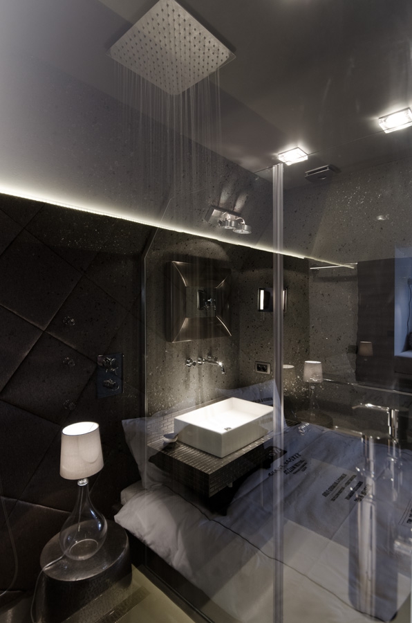 Třeba tu v bytě na Osici. Je tam dlouhá místnost, mělo jít původně o oddělenou koupelnu a ložnici. My jsme prostory propojili kouřovým sklem s posuvnými dveřmi. Koupelnu jsme pak rozdělili na dvě části: jednu se sprchou, umyvadlem a záchodem, kterou majitelé používají opravdu často. V jiném cípu je relaxační kout s vanou. Rozdíl jsme naznačili i materiály. V užitné části jsme použili stěrku, kolem vany zase mozaiku. Na Ostrovského a na Mostecké jsme vytvořili prosklené sprchové kouty směrem do ložnice. V Plzni jsme do katalogového projektu udělali ložnici, na niž navazuje šatna a sprcha s umyvadlem otevřená do krovu a oddělená černým sklem. V projektu 12 lofts také máme volně stojící vanu a provozy jsme rovněž odlišili barevně. Vedle vany často věšíme lustry.