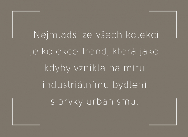 Nejmladší ze všech kolekcí je kolekce Trend, která jako kdyby vznikla na míru industriálnímu bydlení s prvky urbanismu. Čtyři vzorované odstíny šedé, které dokonale padnou do moderních minimalistických interiérů. Kombinujte je s kovovými prvky, nebo naopak s přírodním dřevem či pokojovými rostlinami.