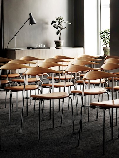 V konferenčních místnostech už nemusíte sedět na stále stejném typu židlí. S židlemi CH88 od designéra Hanse J. Wegnera zažijete pohodlné a stylové posezení. Ocelový rám s rovnými zadními nohami nese oválné dřevěné sedadlo. Tato kombinace materiálů spolu s minimalistickým designem vede k lehkému, organickému a průmyslovému výrazu těchto stohovatelných židlí. K dostání u Carl Hansen and Son.
