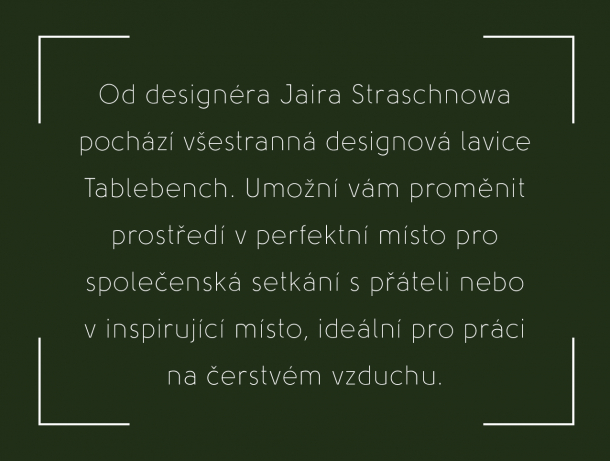 Od designéra Jaira Straschnowa pochází všestranná designová lavice Tablebench. Jde vlastně o lavici i stůl zároveň. Umožní vám proměnit venkovní prostor v perfektní místo pro společenská setkání s přáteli nebo v inspirující místo, ideální pro práci na čerstvém vzduchu. Spojením lavic vytvoříte perfektní posezení se stolem uprostřed. Díky odolnému dřevu Accoya a galvanizované oceli vám navíc budou lavice sloužit opravdu dlouho. V obchodě Designpropaganda je seženete v různých velikostech.