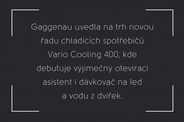 Gaggenau věří, že kuchyně je srdcem i duší domova a výrobky, které vyrábí, perfektně a bezproblémově fungují a skvěle se integrují. Řada Vario Cooling 400 jsou kuchyňské spotřebiče, které se stávají průkopníky pro funkční umění, jež vyhoví životnímu stylu i náročných uživatelů.