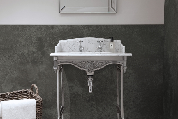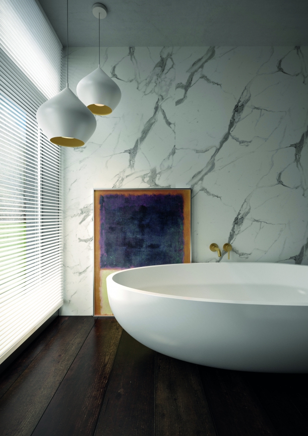 Koupelna s obklady Calacatta z řady Nuance britského výrobce Bushboard.