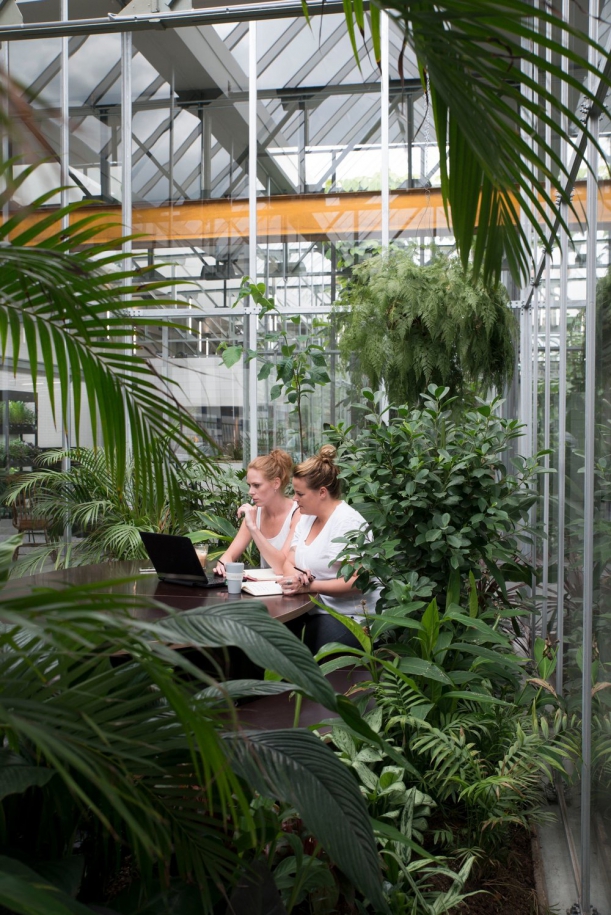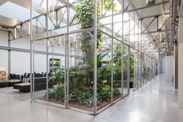 Rostliny najdete i v novém amsterdamském sídle nizozemské firmy Joolz, která vyrábí mimo jiné kočárky. Studio Space Encounters renovovalo interiér bývalé továrny, v jejímž nitru dnes stojí tři skleníky s pečlivě pěstovanými rostlinami. V zeleni můžou zaměstnanci firmy i pracovat – změní tak prostředí a dostanou nové impulsy.