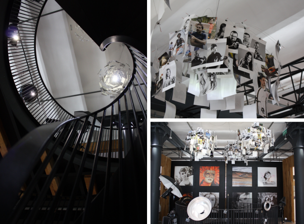 Podlaha v patře je potažena linoleem a mimo zázemí pro workshopy tu najdete i ateliér a doplňkovou prodejní plochu. Fotografie na panelech před fotostudiem, kde probíhají různá školení, se mění podle druhu akce, jež zde právě probíhá.