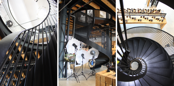 Schodiště, které původně vedlo napříč prostorem v době, kdy se tu nacházely kanceláře, nahradili architekti centrálním točivým schodištěm.