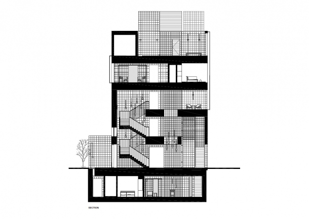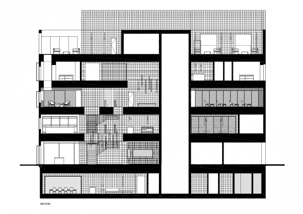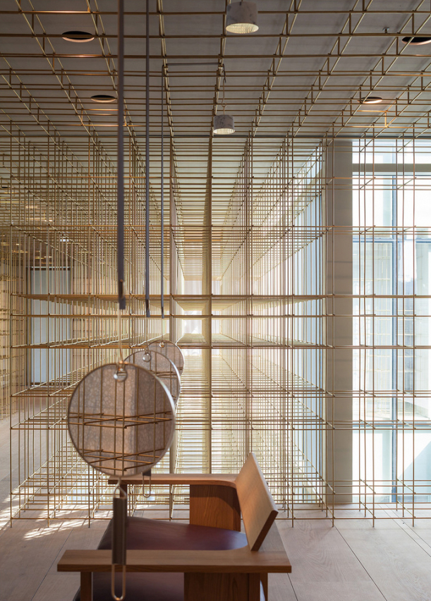 Čím návštěvníci stoupají výš, tím víc se prostor odlehčuje, dokud se nedostanou až na střešní terasu, kde mřížová struktura vytváří vzdušné a oddělené salónky s různými výhledy na město.