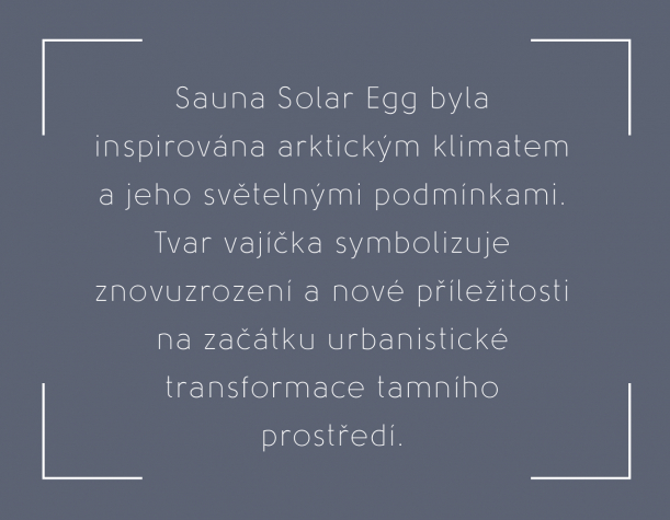 Sauna Solar Egg má tvar vajíčka, které symbolizuje znovuzrození a nové příležitosti na začátku urbanistické transformace tamního prostředí. Projekt totiž zahrnuje přemístění celých městských částí v reakci na pokles půdy, způsobený desítkami let těžby železné rudy.