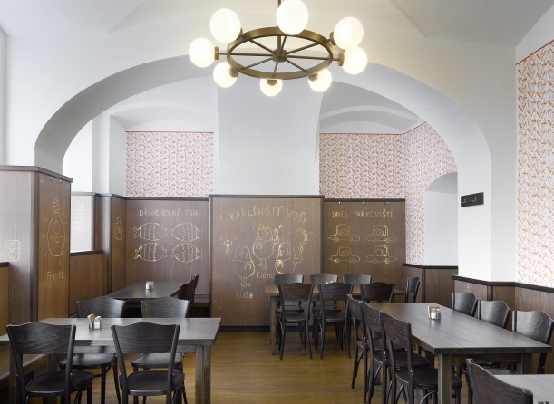 Klement Gottwald, Antonín Zápotocký a Rudolf Slánský! V domě v Sokolovské ulici sídlila totiž v letech 1921-1938 Komunistická strana Československa, která byla v Národním domě v Karlíně založena 14. 5. 1921. Vedoucím představitelům strany se tedy poněkud posměšně přezdívalo „karlínští hoši“. Rytiny v celém lokále znázorňují spoustu dalších zajímavostí týkajících se Karlína. Věděli jste například, že Karlín byl roku 1904 povýšen na město nebo že originální německý název předměstí Karolinenthal se do češtiny zprvu překládal jako Karolinčany, Karolinino údolí, Karlyň a Karlínov?