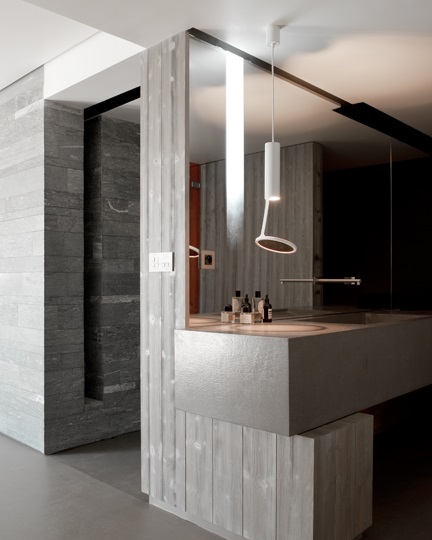 Každá ložnice je doplněna vlastní koupelnou i záchodem. I zde zůstal designér věrný strohosti a barevné vyváženosti. Lampu Loup O ceiling nabízí značka Kundalini. Masivní umyvadlo nese kovová konstrukce pokrytá betonem.