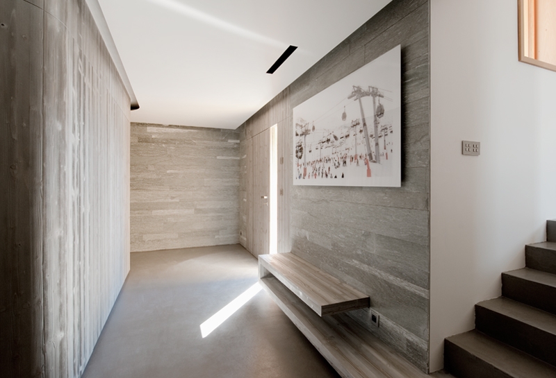 Betonové schodiště vedoucí do vyššího patra je lemováno masivní ocelovou zástěnou. Jednotlivé schody pak oddělují mezery, které v kombinaci se světlem v průběhu dne vytváří hravé odlesky. Celkový intenzivní dojem doplňuje osvětlení Wind Ceiling Lights designérky Johanny Grawunder.