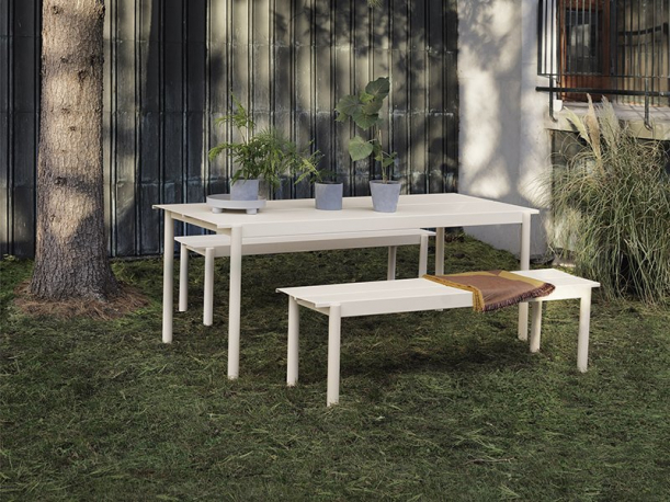 Posedět můžete i u stolu Linear od značky Muuto. z odolné galvanizované oceli s práškově lakovanou povrchovou úpravou, odolávající povětrnostním vlivům. Díky desce stolu, která je záměrně složena ze dvou částí s ohnutými hranami, se navíc rychle odvádí dešťová voda. Oceníte především jednoduché linie a čistý design. Přesvědčit se můžete v showroomech Stockist.