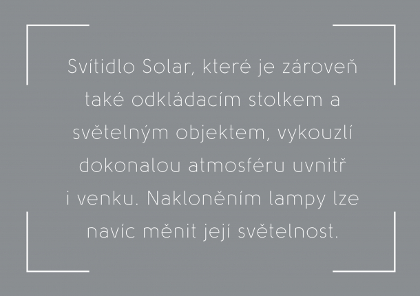 Osvětlení, stolek, či rovnou světelný objekt? To je stojací svítidlo Solar od italské značky Foscarini. S ním vykouzlíte dokonalou atmosféru uvnitř i venku. Nakloněním lampy navíc můžete měnit její svítivost. Na odkládací plochu z lakovaného kovu či dřevěné dýhy můžete odkládat jakékoliv drobnosti. Venkovní varianta obsahuje glazovaný kov s rezavým vzhledem. Seženete v showroomech Hagos, Stockist a Designpropaganda.
