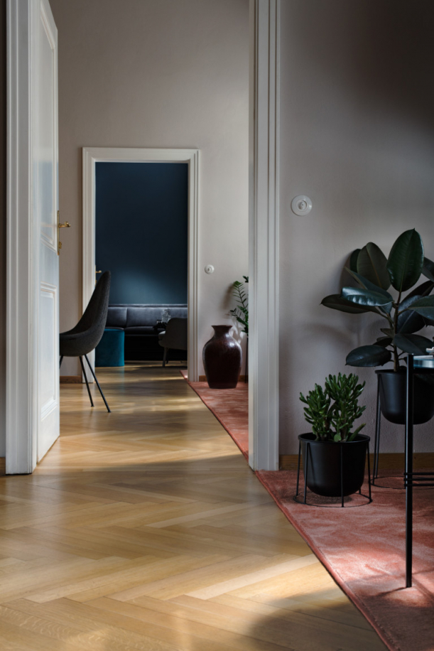Barevné schéma můžete pozorovat i na nábytku a doplňcích. Sametové pohovky v temných modrých a růžových odstínech doplňují výrazné válcové pufy. V růžovém tónu se nese i koberec, který spolu s parketami propojuje všechny místnosti. Nenucené rozmístění nábytku do kompaktních celků, zcela odlišných od klasického kancelářského prostředí, dodalo celému prostoru stylový klubový nádech. Designérka vybírala z nábytkových kolekcí současných i historických značek. Najdete tu například kancelářské stoly Master & Master, židle Drop výrobce Fritz Hansen od Arne Jacobsena či lampu Mantis od sochaře Bernarda Schottlandera a mnohé další kousky.