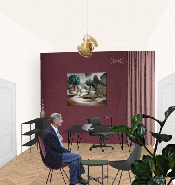 „Chtěli jsme vytvořit nové reprezentativní i pracovní prostory, které budou mít nádech moderního uměleckého salonu. Tak, aby díla na stěnách vynikla a klienti se u nich rádi zastavili,“ vysvětluje designérka Denisa Strmisková. „Design interiéru vznikal jako doplněk k těmto uměleckým dílům. Vybírala jsem zajímavé kousky a materiály, které si budou s obrazy na stěnách povídat. A zároveň budou zajímavými solitéry současného designu.“