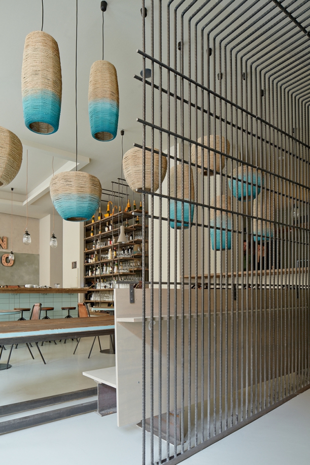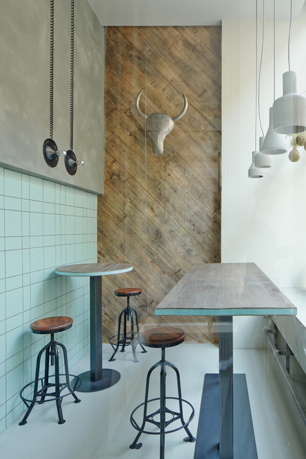 Šikovné jsou háčky na kabelky, které najdete na každém stole. Lavice jsou vyrobené z lazurované překližky. Na zemi použily architektky zalakovanou epoxidovou stěrku, která je odolná vůči poškození a snese velkou zátěž. V zadní části podniku je stěrka v bleděmodrém odstínu.