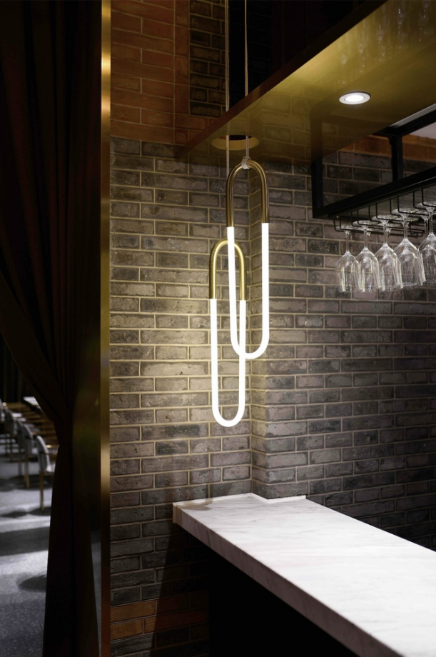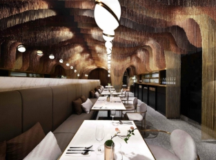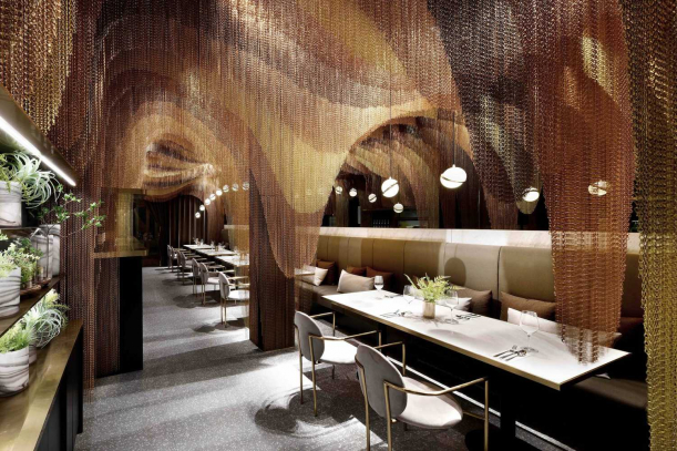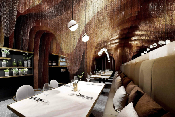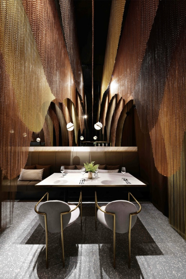 Na první pohled vypadá restaurace prostorně, trochu jako blýskavá jeskyně s různými zákoutími. Při bližším pohledu ale zjistíte, že tak veliká není. Strategicky umístěné zrcadlo za banketovým posezením dodává pocit prostornosti v jinak úzkém prostoru. Celkový výběr tlumené palety šedých a hnědých tónů doplňují kontrastní bílé stoly. Mosazné detaily židlí a stolů, šedá terrazová podlaha, jemné odstíny čalounění i matný černý nábytek poskytují vizuální odpočinek, který však neubírá nic z celkového nenásilného luxusu restaurace.