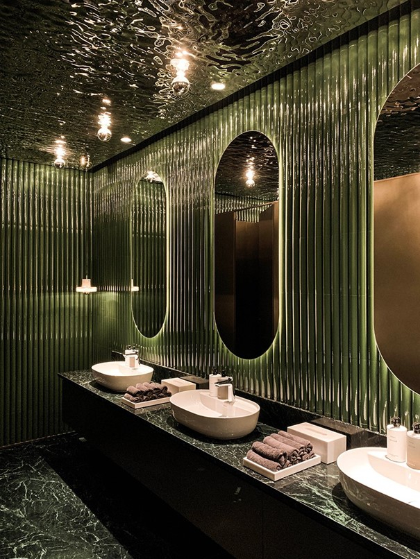 Prvek zrcadlení na stropě najdeme i v prostorách hygienického zázemí pro hosty. Temně zelený obklad stěn a mramor na umyvadlové desce i podlaze navozují velmi výjimečnou atmosféru.
