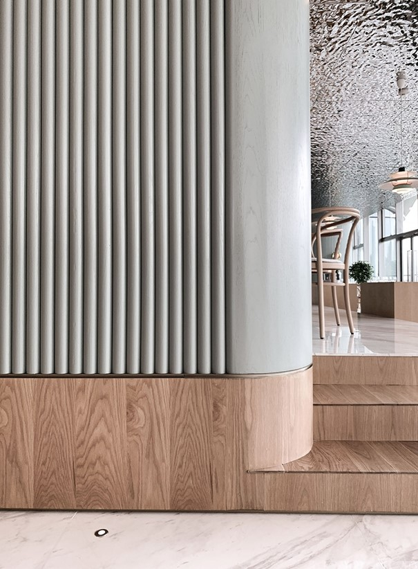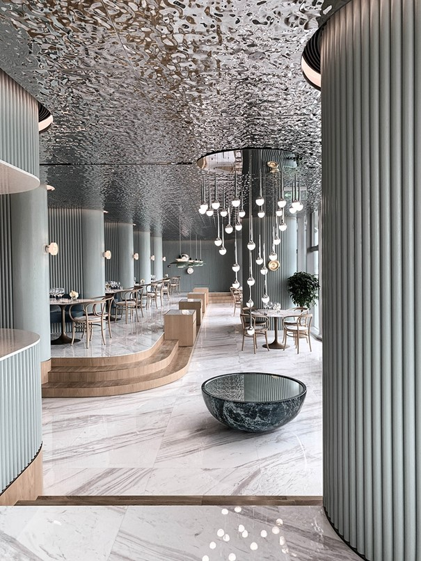 Barevná paleta interiéru restaurace je inspirována měnícími se odstíny řeky v průběhu dne. Klidnou atmosféru doplňuje bílá mramorová podlaha s kresbou, která připomíná přirozený pohyb tekoucí vody v Perlové řece. Závěsné svítidlo ze stropu imituje padající kapky. Voda jako všudypřítomný symbol provází celý prostor a reaguje tak na hlavní myšlenkový koncept.