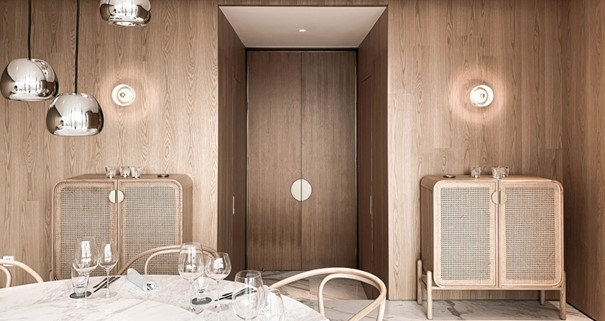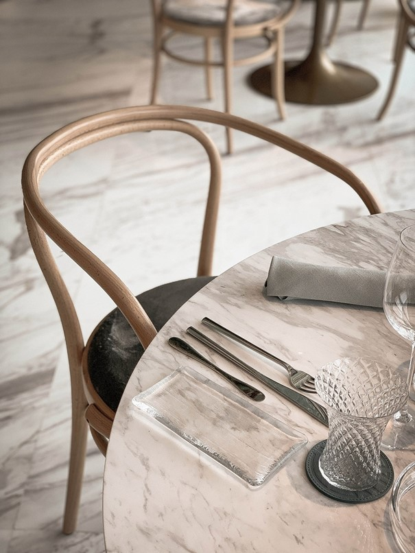 Velký i malý soukromý salonek jsou, stejně jako hlavní prostor restaurace, vybaveny nábytkem z ohýbaného bukového dřeva. Stoly oživují desky z mramoru, použitého i na podlaze.