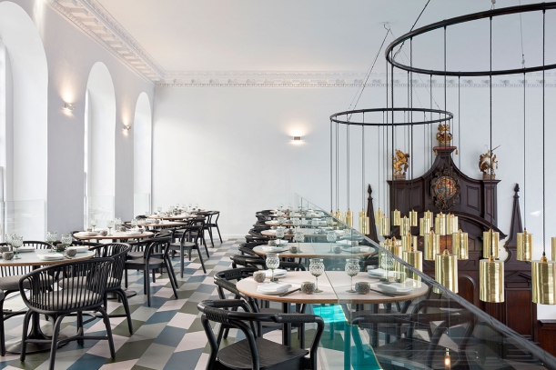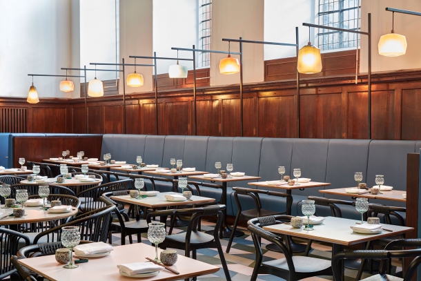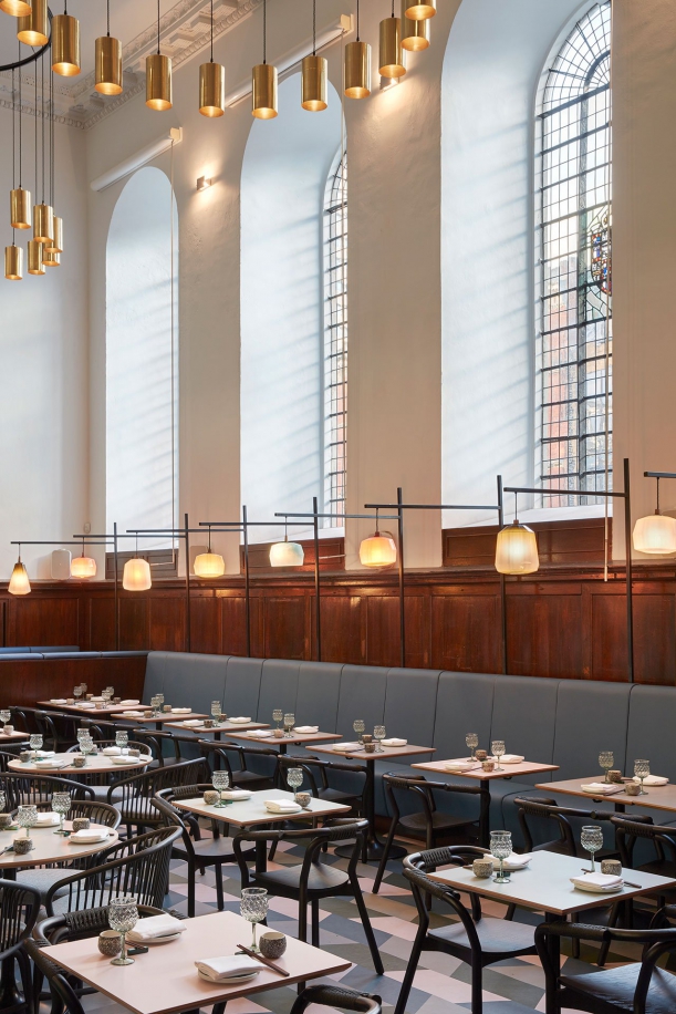 S přihlédnutím na vysoký, osmimetrový strop kostela, začlenili architekti do prostoru mezipatro, které obklopuje dvě strany restaurace a slouží jako další jídelní prostor. Z této úrovně se i díky prosklené balustrádě nabízí všem návštěvníkům úchvatný výhled na celý interiér, zatímco v přízemí mají hosté postaráno o kulinářská kouzla kuchařů v otevřené kuchyni.