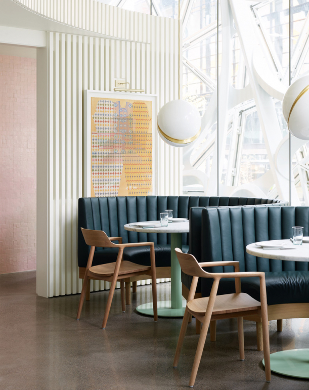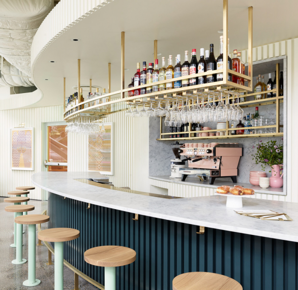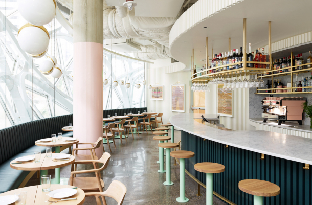 Elegantní materiály z mramoru, dlaždice i mosaz v kombinaci s pastelovou paletou barev dodávají interiéru punc originality. Atmosféru doplňují i organické formy a zakřivení pultů, stěn či polic. Jídlo a architektura se tu setkávají v prostoru, který ctí kulinářské tradice Itálie a zároveň také odráží moderní strukturu.