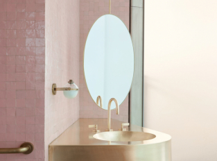Toalety zdobí mosazné prvky a růžové marocké dlaždice.