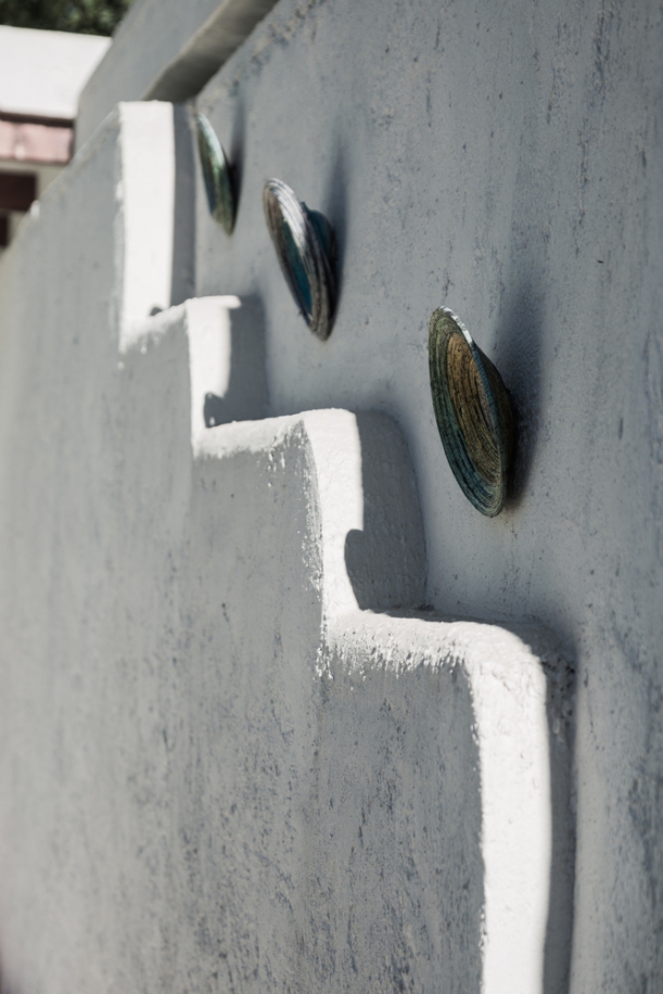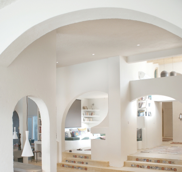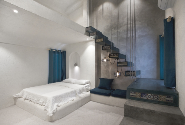 Architekti se v interiéru drželi světlých tónů. Bílá omítka a přírodní, světle okrová podlaha doplňují části stěn s neopracovaným betonem. Vyniká zde tradiční dekor, zdobící schody, závěsné osvětlení, připomínající zdobné lucerny, jež odkazují na zdejší kulturu i klenuté oblouky jednotlivých zdí.