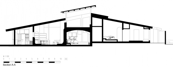 Majitel si přál mít dvě obývací zóny. Jednu pro posezení s rodinou či přáteli v pohodlí půlkruhové sedačky směrované k otevřenému krbu a druhou určenou k odpočinku u filmů. V tomto domácím kině se vyjímá klenutý strop, který zaručuje příjemnou akustiku, a tím pádem i skvělý filmový zážitek.