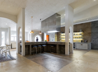 Dominantní velkorysá kuchyň, nahrazující obvyklý velký obývací pokoj, je určená společenským aktivitám. Tento prostor je nekonvenčně rozšířený nejen kvůli vášni k vaření, ale také kvůli tomu, že hosté raději tráví většinu času právě v kuchyni u barového pultíku než v obývacím pokoji. Součástí této veliké místnosti jsou kromě barového posezení také dva jídelní koutky. Jeden s moderním bílým nábytkem a druhý tradičnější, s nízkými stoličkami a betonovým stolem, nad nímž se honosí zdobný lustr.