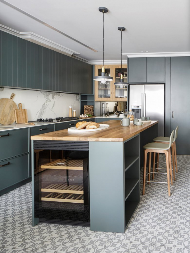 Kuchyň nabízí komfortní prostor pro přípravu pokrmů pro celou rodinu. Světlé mramorové plochy s jemnou kresbou dodávají místnosti lehkost. Zároveň mírně tlumí poměrně výraznou barevnost dvířek kuchyňské linky. Ocelově modrá dvířka v kombinaci s dřevěnými detaily vytváří velmi elegantní souhru materiálů.