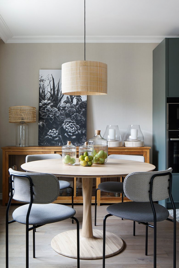 Jídelna se nachází v hlavním obývacím prostoru a stává se tak jeho nedílnou součástí. Naše pohledy jistě upoutá velmi originální svítidlo nad jídelním stolem, které přirozeně sestupuje ze stropu jako magický přívěšek. Osvětlení, které může připomínat souhvězdí noční oblohy. Dokonalá symbióza mezi designem a zdrojem světla.