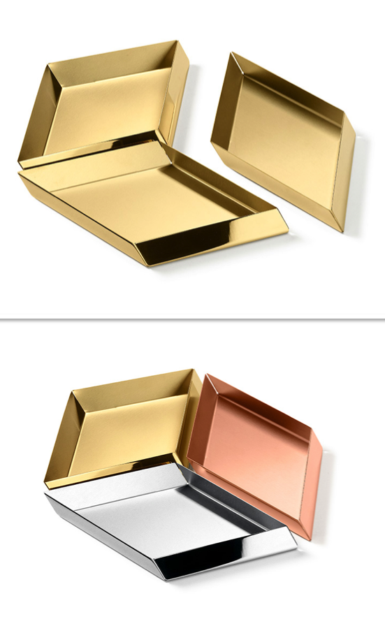 Odkládací místo se hodí vždy. Stačí miska, kterou umístíte na stolek nebo kabinet. A pokud se nespokojíte s něčím obyčejným, pořiďte si jako dekoraci misky Axonometry Cube z dílny Ghidini 1961. Díky svému tvaru a sklonu vytváří iluzi 3D. Jednotlivé díly mohou být ve stejném provedení nebo jako mix všech tří variant: Brass polished, rose gold, steel polished. Autorkou designu je Elisa Giovannoni.