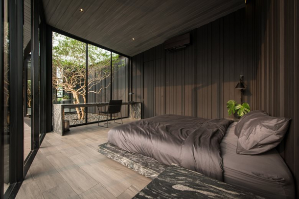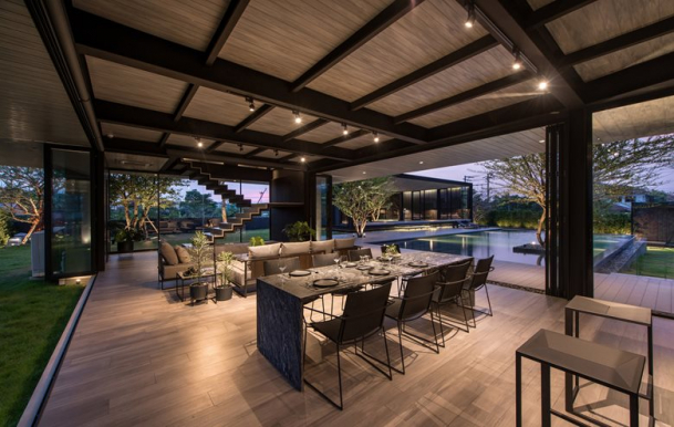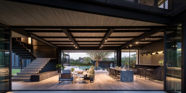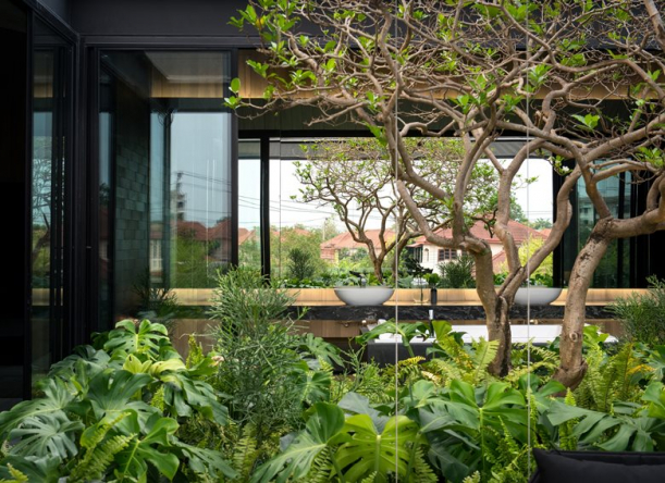 V thajském Bangkoku se zrodilo jedinečné rodinné sídlo. Architekti dostali volnou ruku a navrhli dům, jako by byl jejich vlastní. Hlavním prvkem prostupujícím celým projektem se stalo atrium. Místo, kudy přichází nejen sluneční světlo, ale může i padat déšť. Šikmý povrch umožňuje dešti snášet se ze střechy a vytvářet tak působivou tenkou vodní clonu.
