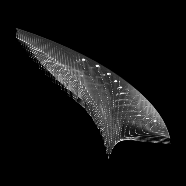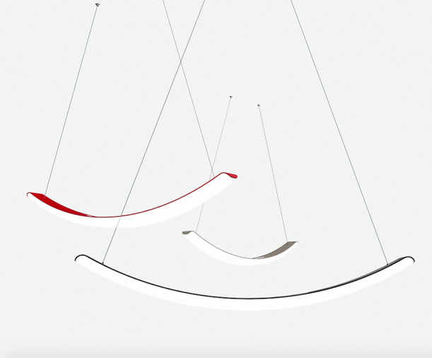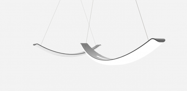 Svítidlo BENT visí na ocelových lankách, kterými vede elektrika, žádné kabely tu nehledejte. Hliníkový oblouk slouží jako chlazení. „Připomíná mi houpačku na lankách,“ směje se designérka.
