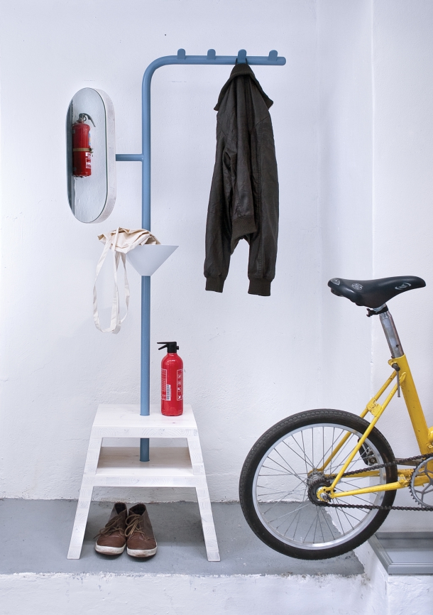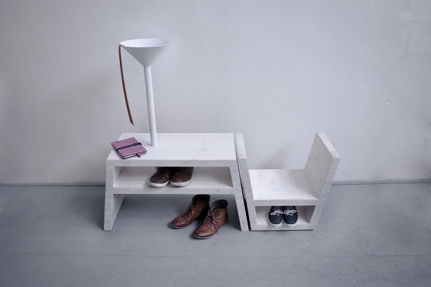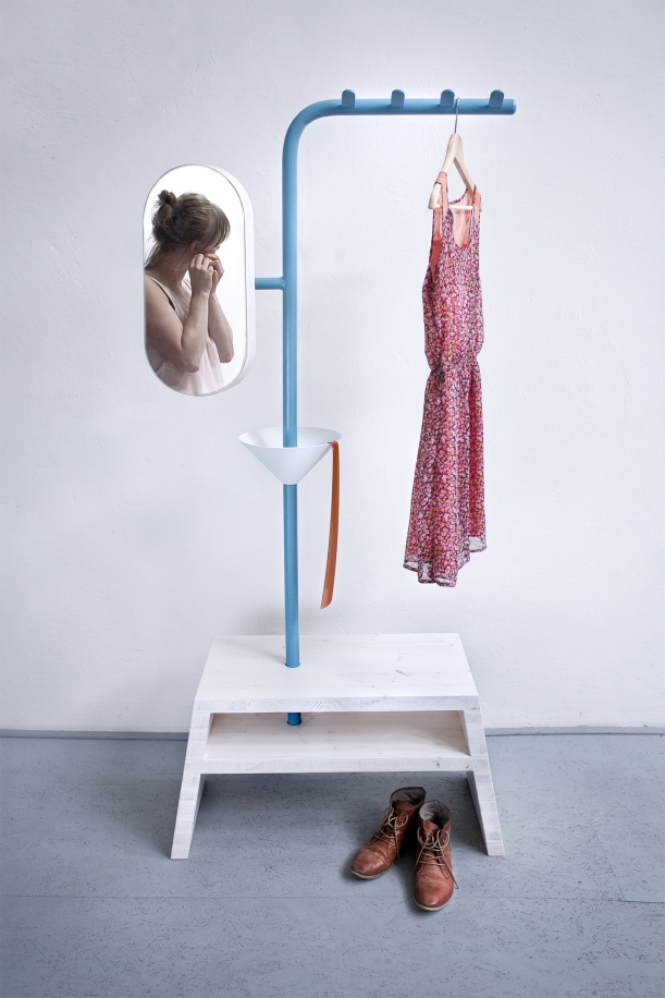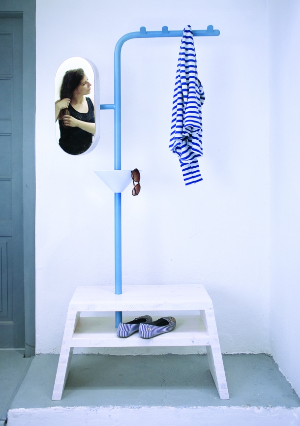 Světlem však portfolio Simony nekončí. Pro společnost Domesi, která se specializuje na dřevostavby, navrhla multifukční objekt Tudy, prosím. Součástí zadání bylo vymyslet objekt, který by se mohl vyrábět z odřezků smrkových panelů, jež firma při používá při výrobě nábytku. Jednoduchá dřevěná konstrukce s kovovými detaily v sobě pojí zrcadlo, odkládací prostor, botník i věšák. Všechny části objektu lze také používat samostatně. „Chtěla jsem, aby byl věšák vidět, i když na něm bude viset oblečení,“ popisuje autorka návrhu. Lavici na boty můžete použít buď samostatně, nebo ve více kusech – otočením z ní jednoduše vytvoříte lavičku. „Je to taková skládačka,“ dodává Simona.