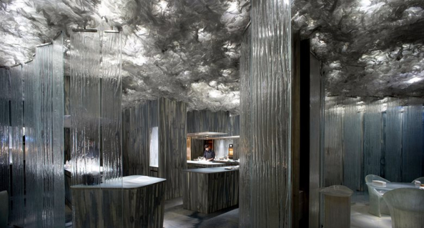 Interiér zdobí kamenné zdi, při jejichž výrobě byly použity nejnovější technologie: speciální digitální tisk Neolith Digital Design Projekt v modrozelených až šedých tónech. Kromě zdí vás jistě zaujme i strop, kde se jako v obláčcích ukrývají nenápaná svítidla, jež svým zabarvením mohou měnit atmosféru restaurace. Téměř každý detail zde byl vyroben na míru. I skleněné textury, podobné dřevěněnému rastru, a židle, které jako by vytesal sám mistr do kusu ledu.