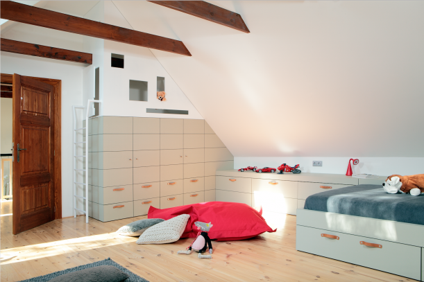 Dětský pokoj nenarušuje svou hravostí celý koncept domu, ba právě naopak. Jeho nespornou výhodou je velké množství úložných prostor, které kopírují zkosené stěny podkroví. Na první pohled nevyužitelná zákoutí poslouží malým obyvatelům jako dětský koutek na hraní. Částečně zakryté kulaté okno v čele místnosti je jedním z odkazů na historii domu.
