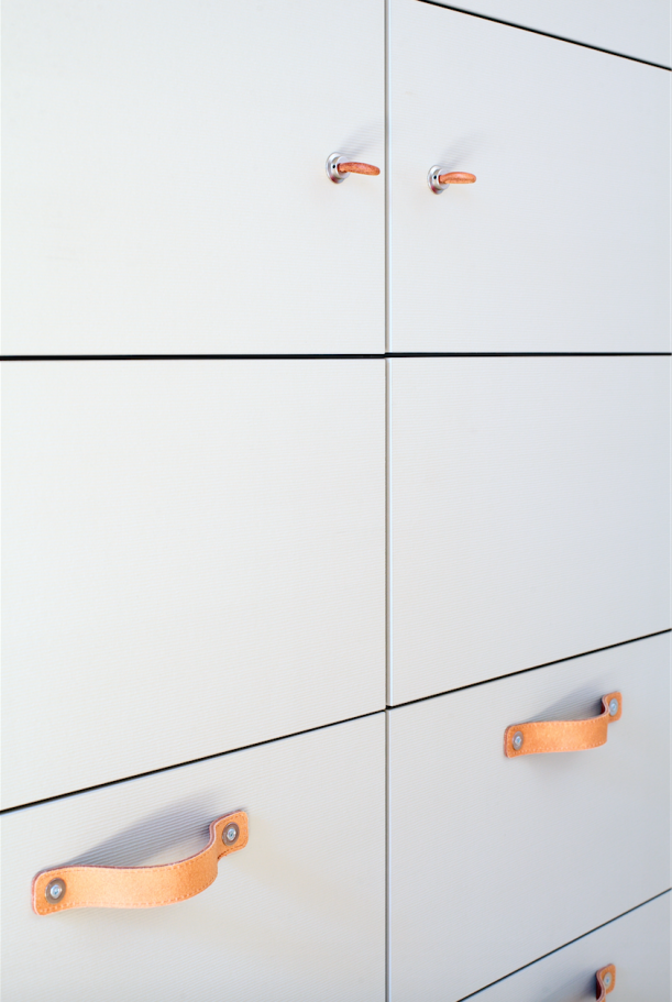 Péče designérky se projevila i na těch nejmenších detailech, jako jsou kožená madla u skříněk na poklady pro děti.