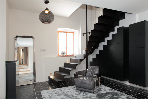 Do patra můžete vystoupat po minimalistickém černém schodišti, jež má místo zábradlí pouze nerezová lanka.