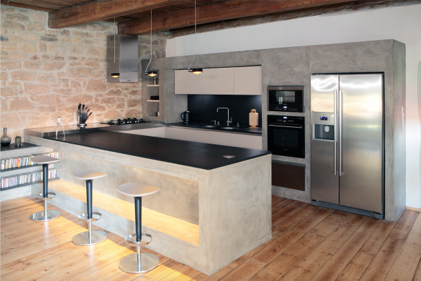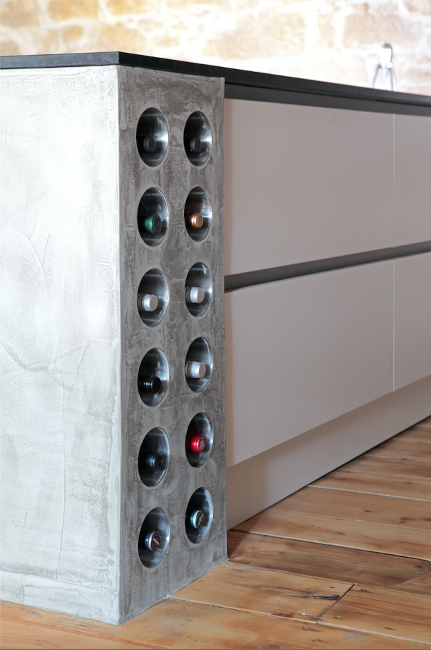Systém na ukládání vína tvořený nerezovými trubkami vloženými do betonu je nejen zajímavým detailem interiéru, ale také chytrým pomocníkem v kuchyni.