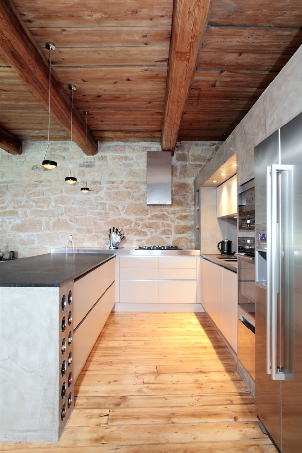 Netradiční použití betonu se ukázalo jako dobrá volba, skvěle totiž koresponduje s dřevěnými stropy, podlahou i odhaleným zdivem.