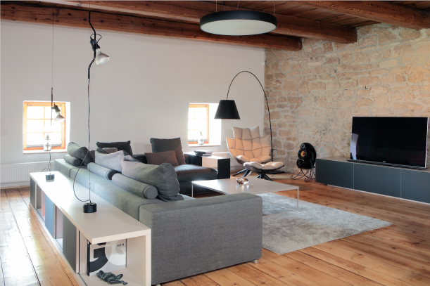 Chloubou obývacího pokoje se stala zachovalá prkna ze starého mlýna, která schoval bývalý majitel usedlosti. Pohodlné sezení poskytuje velká sedačka Groundpiece od známého designéra Antonia Citteria. Dalším ikonickým prvkem je polstrované křeslo HUSK od španělské designérky Patricie Urquioly.
