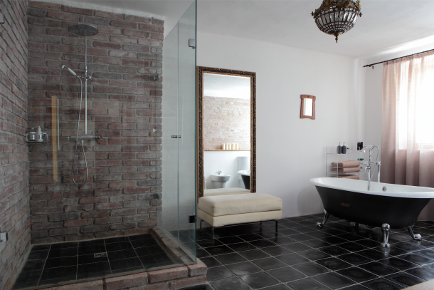 Podlahu komfortní koupelny tvoří opět nesmrtelná čedičová podlaha. Za pozornost stojí také netradičně řešený sprchový kout.