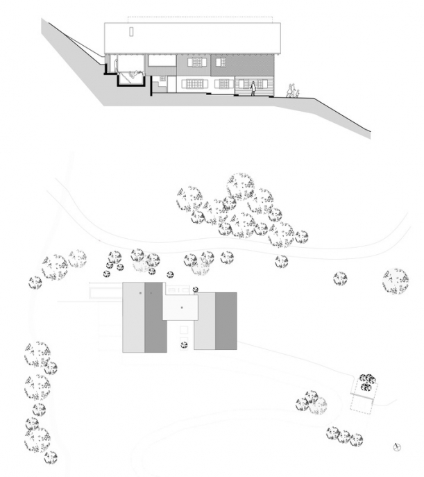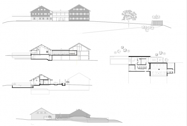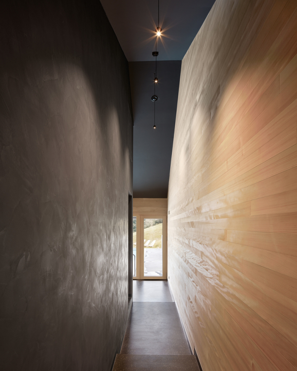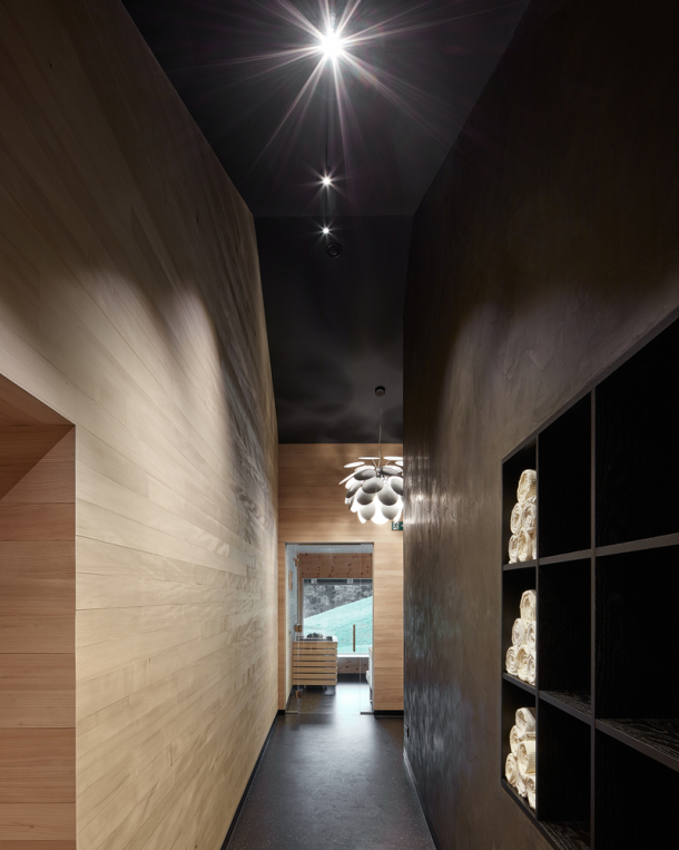 Když vstoupíte dovnitř budovy, dýchne na vás vůně borovicového dřeva z obložení. Architekti zde vytvořili komplexní lázeňské centrum, kde samotné jádro tvořené tmavými zdmi obsahuje saunu, sprchy, krb i infračervené kabiny. Projdete-li celým komplexem, užijete si uklidňující procházku se zvuky stříkající vody i syčícího ohně, doplněné mnoha výhledy.