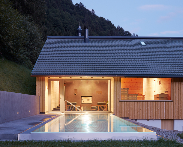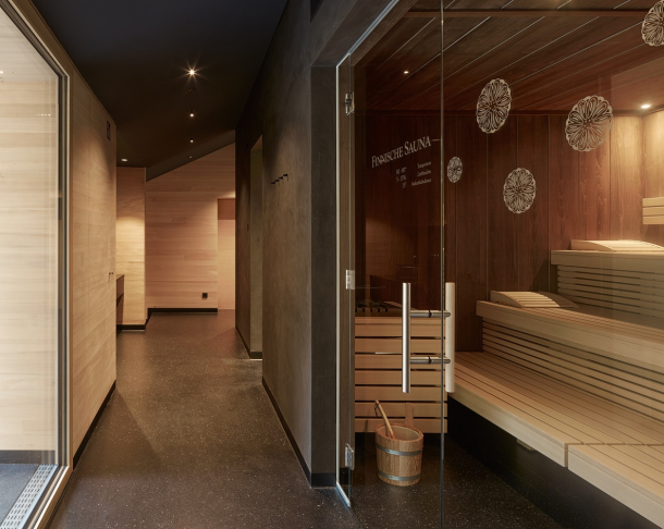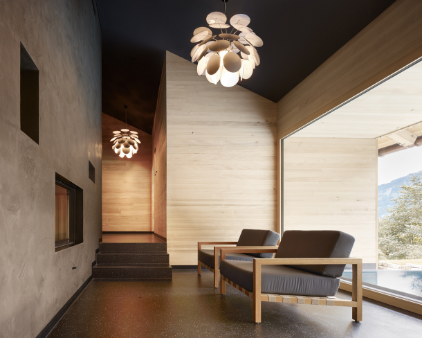 Wellness centrum je prostorné a rozmanité. Na 300 metrech čtverečních zde najdete vše potřebné pro maximální komfort. Samotná saunovací místnost obsahuje veliké okno s výhledem na bazén a vzdálené hory. Tmavou podlahu z terrazza kontrastně doplňuje přírodní dřevo v obložení.