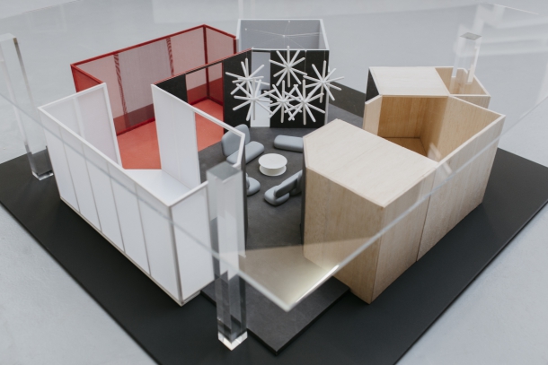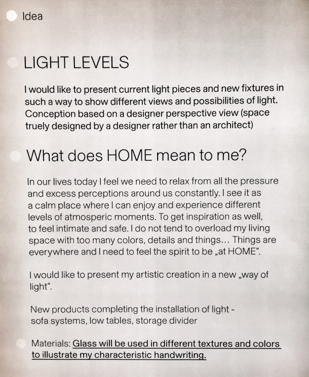 Designérka dostala k dispozici 180 metrů čtverečních a celou plochu rozdělila do zón. Centrální místnost, určenou ke společenskému dění, obklopují soukromější prostory. Každý z z nich je pojatý jinak, vždy v závislosti na funkci. Jednotlivé pokoje však nedefinují zdi, ale světlo. Zatímco pro jeden prostor je určující reprezentativní osvětlení, jinde si Lucie Koldová hraje s intimní a klidnou atmosférou. Nechybí ani prostor pro přijímání hostů, práci a relaxaci. „V návrhu hraje hlavní roli světlo. To pak doplňuji nábytkem, který je mi blízký a zároveň dokresluje atmosféru,“ vysvětluje úspěšná designérka, která celou expozici pracovně pojmenovala Light Levels, tedy roviny či úrovně světla.