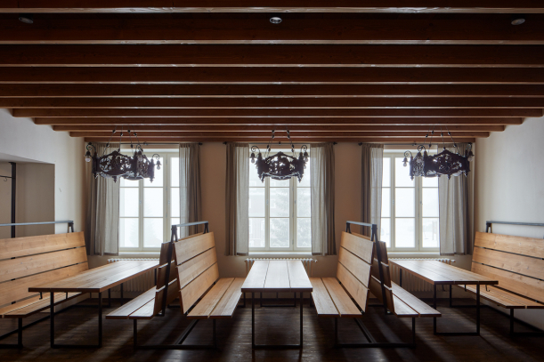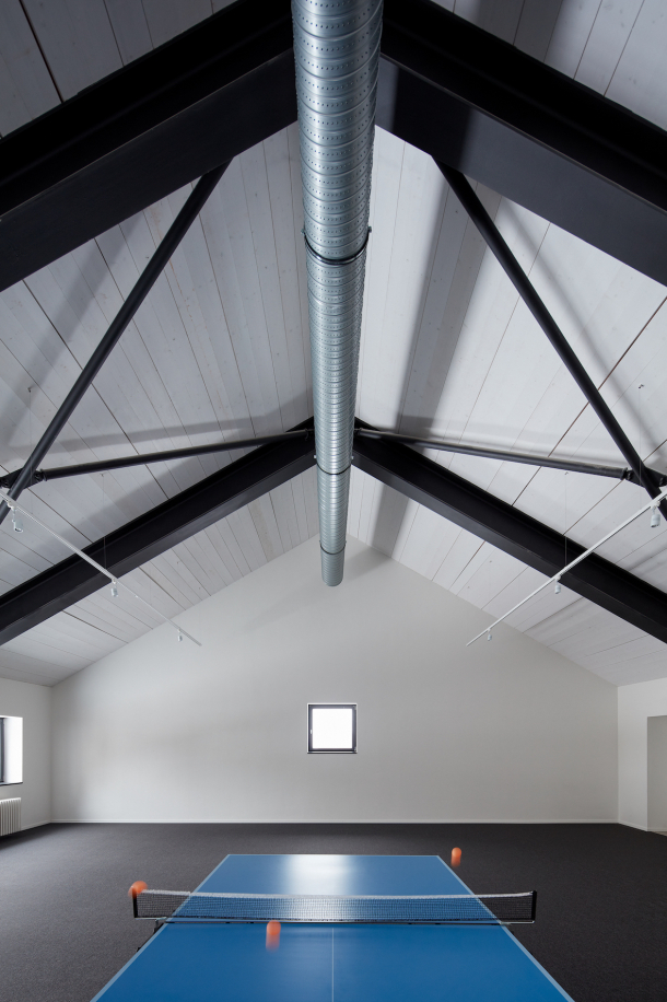 Lyžařská a horalská výstroj není zrovna skladná, a tak museli architekti myslet na úložné prostory. Chytře je zabudovali do postelí, v pokojích najdete i oddělené přihrádky pro jednotlivé cestovatele. Vestavěný nábytek vznikl ze smrkového dřeva. Součástí ubytovny je víceúčelový sál s pingpongovým stolem a promítačkou. „Vytvořili jsme prostor, kde můžou horalové promítat fotky z horolezeckých výprav. Podobně to chodí například na chatě Jelení louky v Peci pod Sněžkou,“ říká Aleš Lapka.