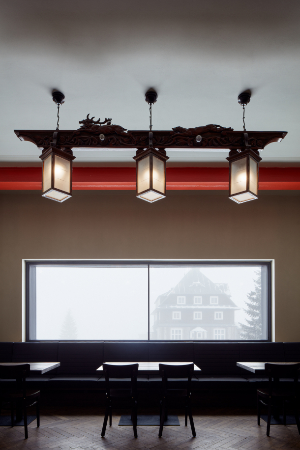 Vyřezávané lustry navozují atmosféru krkonošských pohádek. Architektům je nabídl bývalý ředitel hotelu Družba s tím, že je zachránil z původní chaty. „Jde o pomyslný otisk doby,“ říkají architekti.