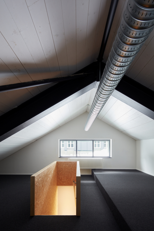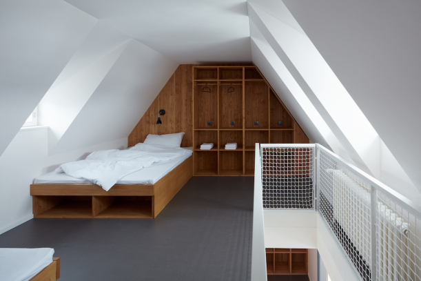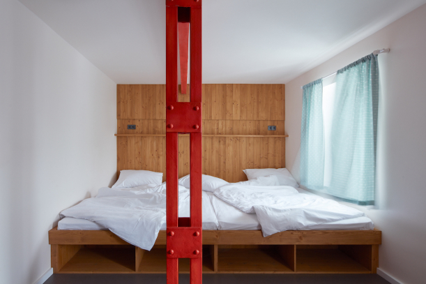 Ubytování najdete ve vyšších patrech a pod střechou. Cestovatelé tu přespávají na velkých dřevěných pryčnách, naskládaní vedle sebe. „Víme, že takový nocleh není pro každého. Nápad jsme převzali z alpských chat, kde je tento způsob nocování naprosto běžný. Horalové přijdou, odloží batoh, vyspí se a druhý den zase vyrážejí na cestu,“ popisuje architekt Aleš Lapka. Součástí ubytovny je rovněž spacákovna. Tady dostanete matraci a prostě se uložíte na zem. Kdo si potrpí na klasiku, může složit hlavu v apartmá.